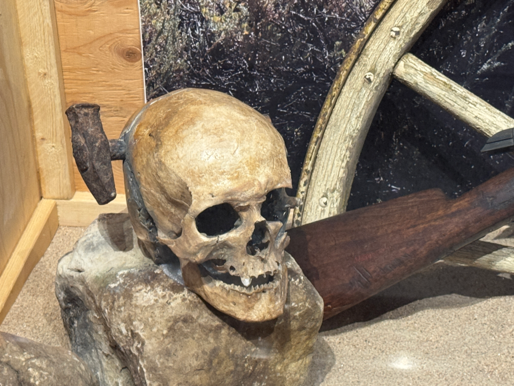 This poor fellow was a gold miner in this area who left the fort dispite a rumor of aggressive indians in the area and was later found, along with his partner and wagon by the side of the road. Why didn’t thos who found him bury him? One of the men was fascinated by how the wheel part was completely through his skull, so he kept it as a curiosity.